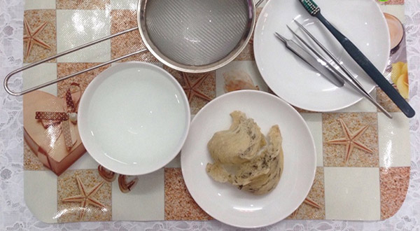 - Cầm tổ yến thô dưới vòi nước chảy nhỏ, dùng bàn chải đánh răng chà nhẹ lên tổ yến thô, giúp loại bỏ bớt bụi bẩn và các lông to trên tổ